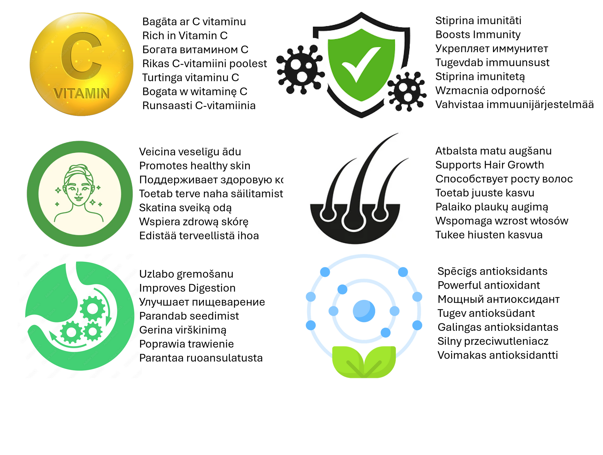 Āmla ir dabīgs C vitamīna un spēcīgu antioksidantu avots. Tā palīdz stiprināt imunitāti un atbalsta ādas un matu veselību. Āmla uzlabo gremošanu un vispārējo vitalitāti.