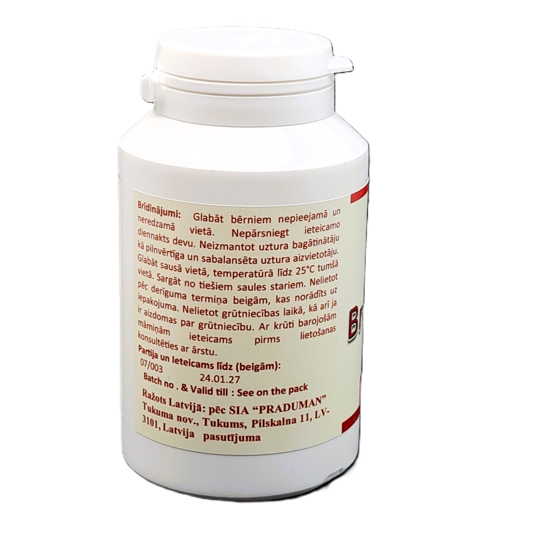Brīdinājumi: Glabāt bērniem nepieejamā un neredzamā vietā. Nepārsniegt ieteicamo diennakts devu. Neizmantot uztura bagātinātāju kā pilnvērtīga un sabalansēta uztura aizvietotāju. Glabāt sausā vietā, temperatūrā līdz 25°C tumšā vietā. Sargāt no tiešiem saules stariem. Nelietot pēc derīguma termiņa beigām, kas norādīts uz iepakojuma. Nelietot grūtniecības laikā, kā arī ja ir aizdomas par grūtniecību. Ar krūti barojošām māmiņām ieteicams pirms lietošanas konsultēties ar ārstu.